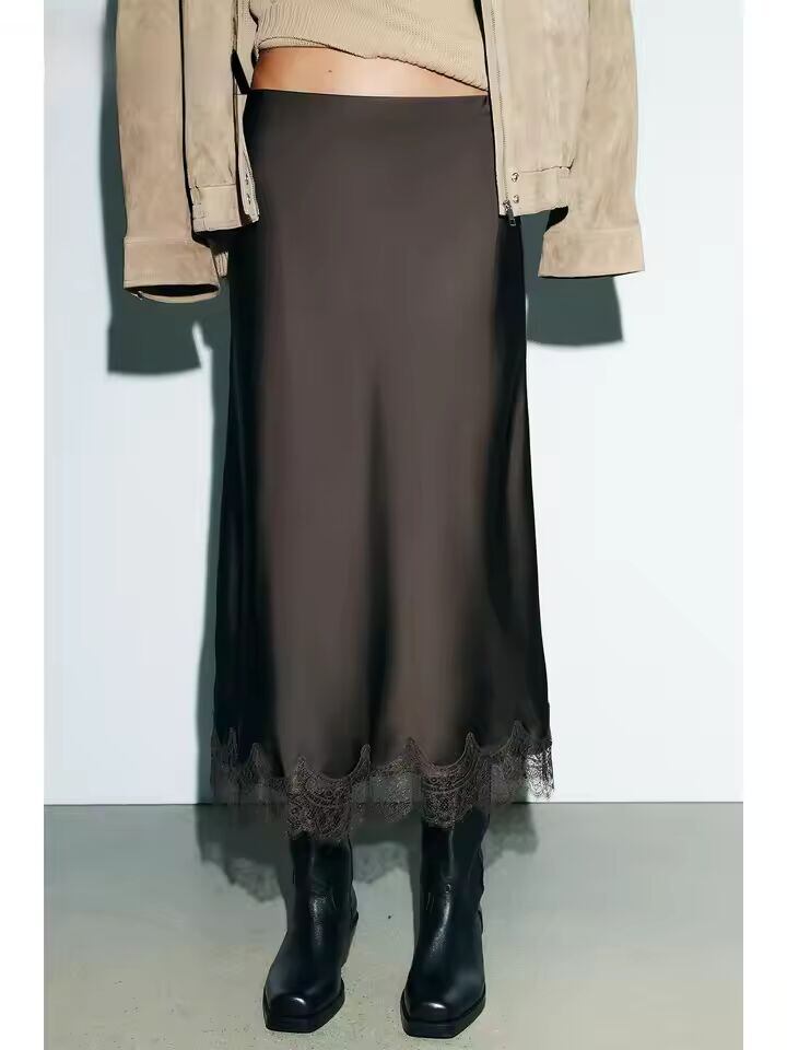 【送料無料】 ZAPRHA 2025秋新作 レーストリム シルクサテン風 ミディ丈 ホルターネック スカート スリム ハイウエスト カジュアル ストレートカット レディーススカート