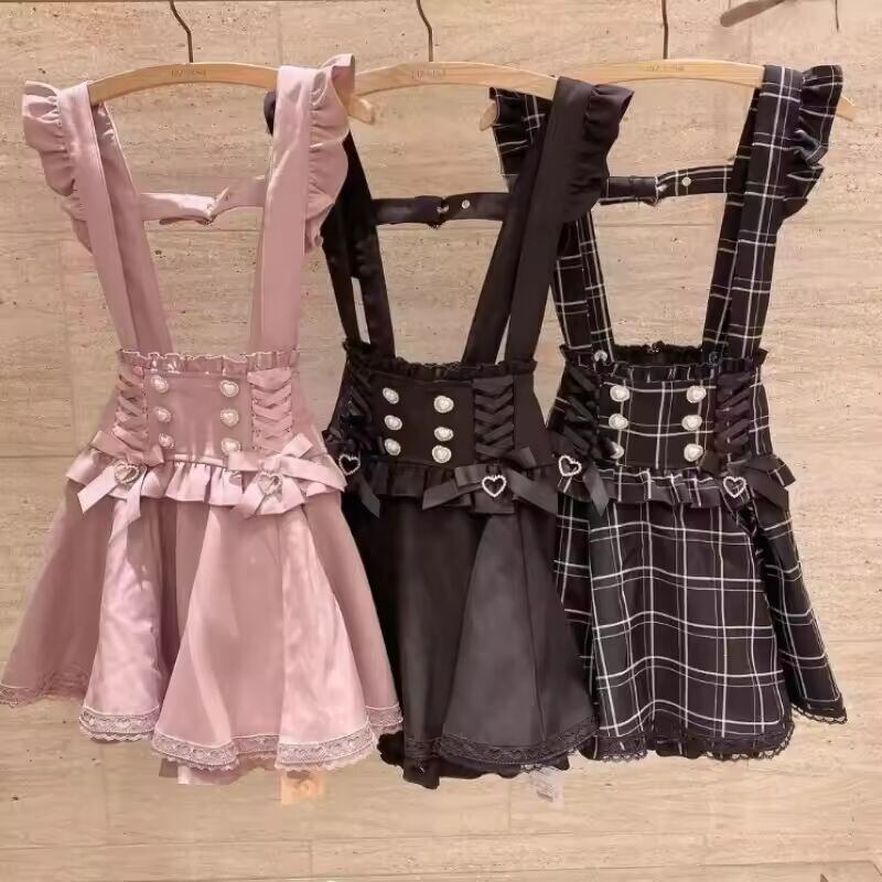 【送料無料】 日本のゴシックリボンショートサスペンダーチェック柄スカート女の子甘いかわいいレース A ラインミニスカート Summer2025 黒固体かわいい