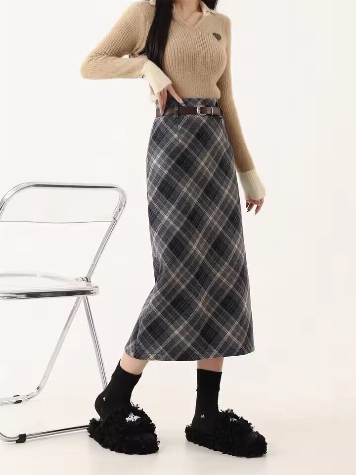 【送料無料】 厚手のウールの格子縞ハーフ丈スカート レディースプラスサイズ 春秋セーター ハイウエスト スリム スリット入りストレートロングスカート