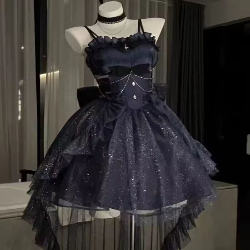 【送料無料】 ゴシック Y2k スリングドレス女性原宿レトロチュールフリルトリムクリスマスパーティー衣装グランジ美的ノースリーブエレガントな着用