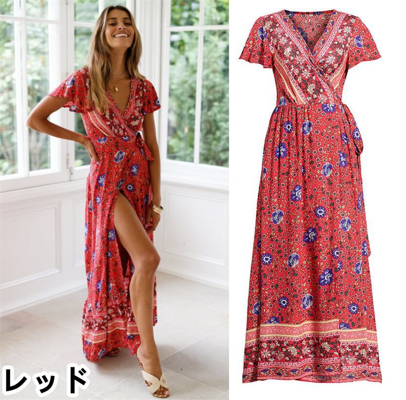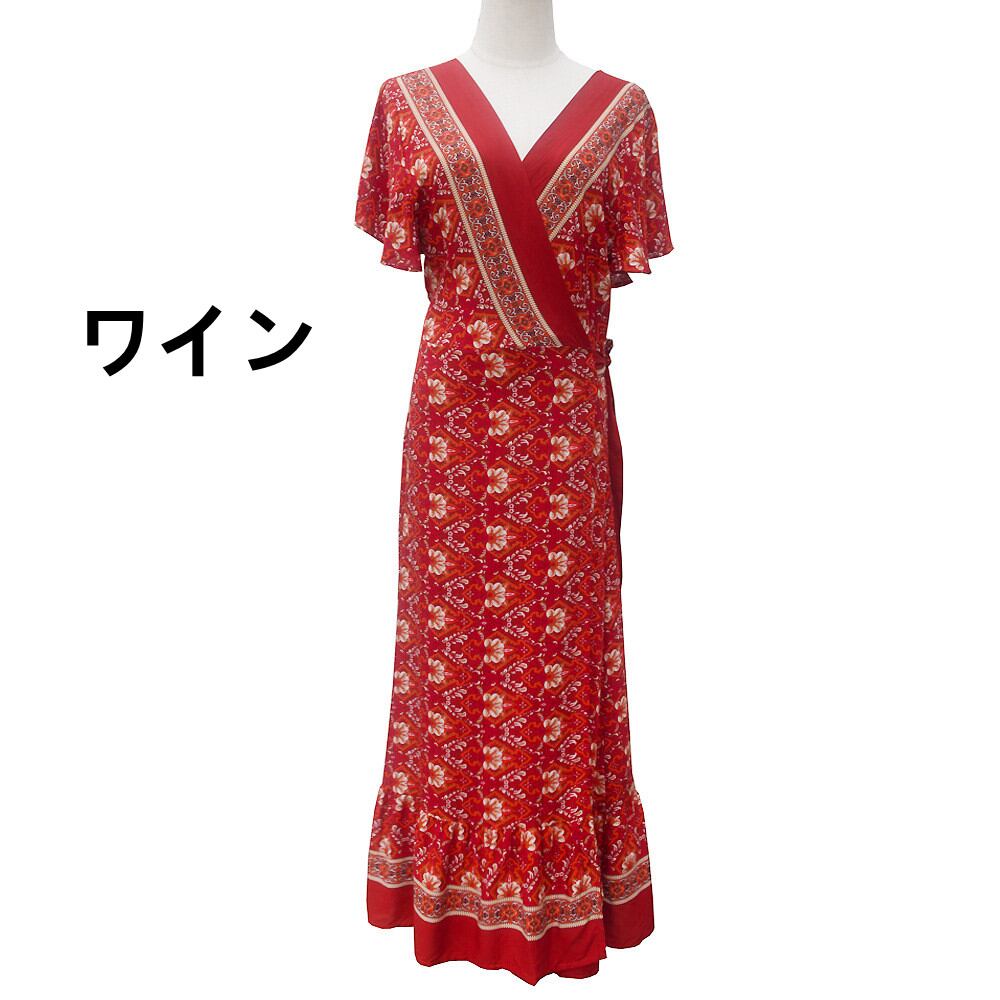 ハワイアン マキシ丈ワンピース 夏 スリット入り ラップ風ワンピース 半袖ワンピース