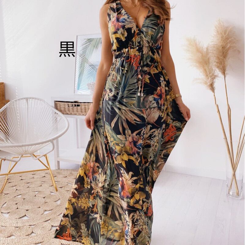 リーフ柄ワンピース ボヘミアン風 前後Vネック マキシワンピース