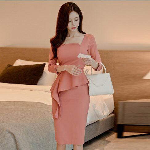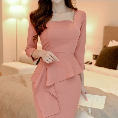 無地ワンピース 7分袖ワンピース フリル ドレス ワンピース