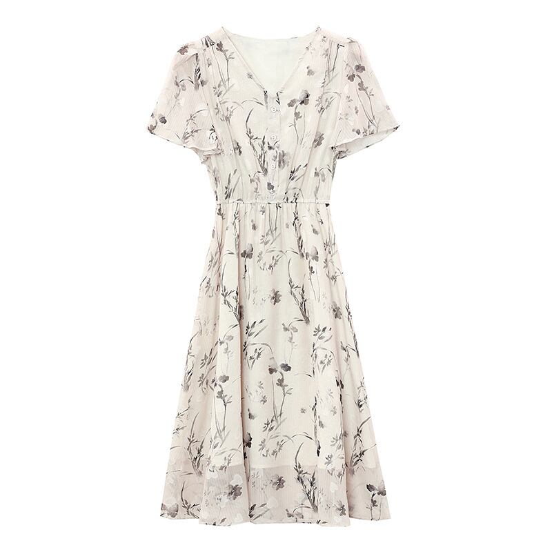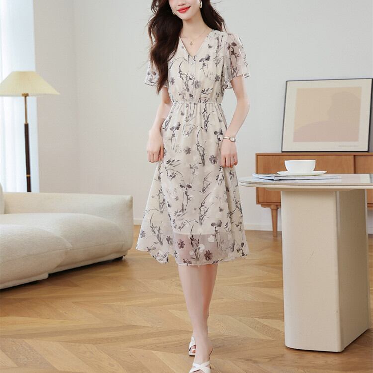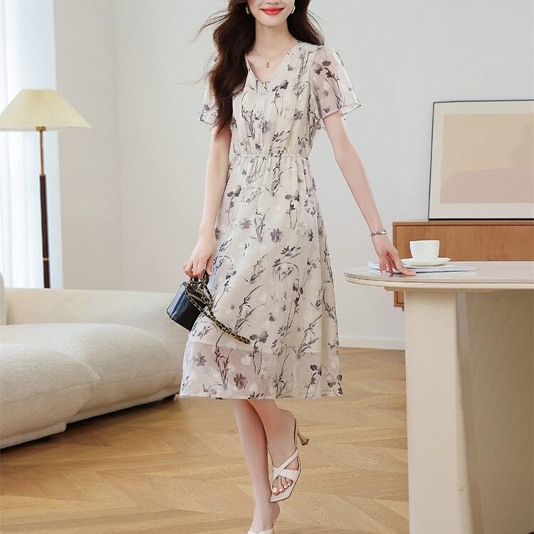 花柄ワンピース シフォンワンピース 夏 レディース 膝下丈 ワンピース 体型カバー リゾートワンピース 半袖