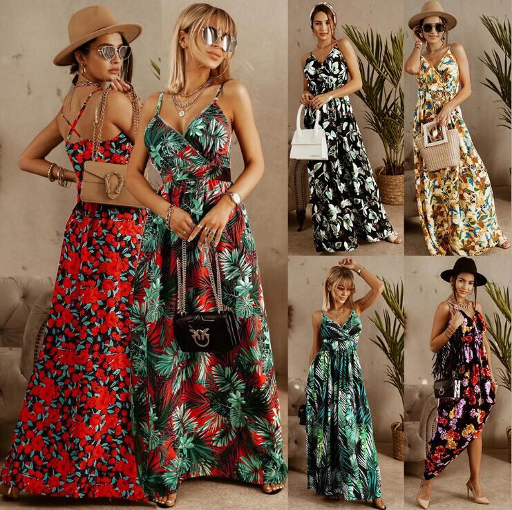 キャミワンピース Vネック マキシ丈 セクシー 着痩せ 葉っぱ柄ワンピース