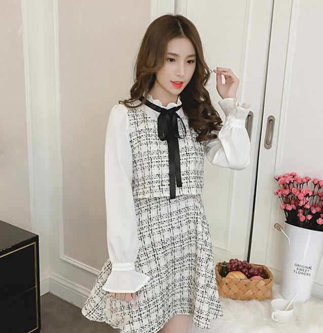 ショート ワンピース ボウタイ ミニワンピース レディース 切り替え 長袖 シャツワンピース 体型カバー
