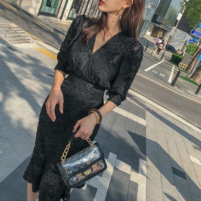 カシュクール ワンピース 黒 ミモレ丈ワンピース ロング Vネック 花柄ワンピース フィッシュテール