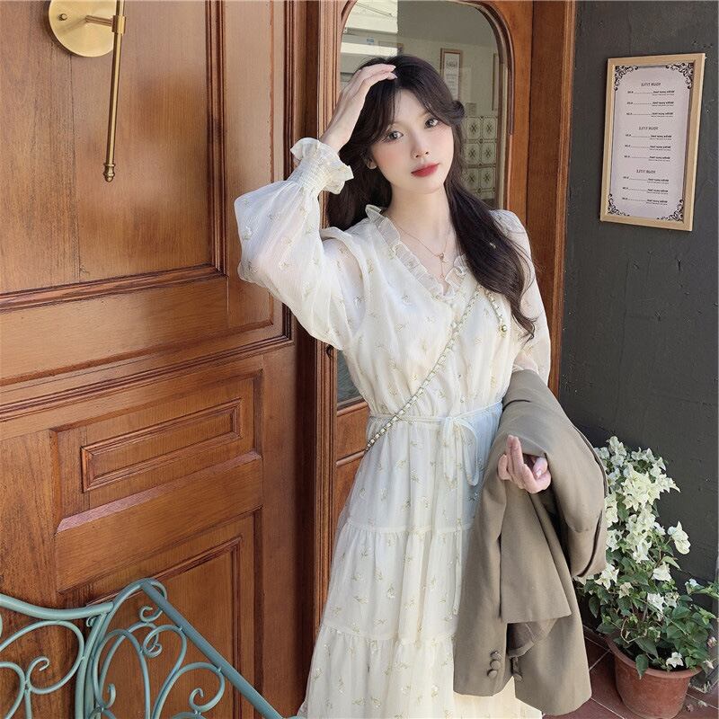 シフォンワンピース ロングワンピース レディース 長袖 小花柄 きれいめ フレア ワンピ 大きいサイズ 透け