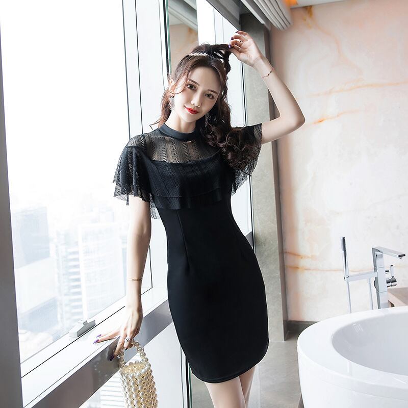 タイトワンピース ショート ミニドレス チュール ワンピース シアー袖 透け感 半袖 ハイウエスト 結婚式