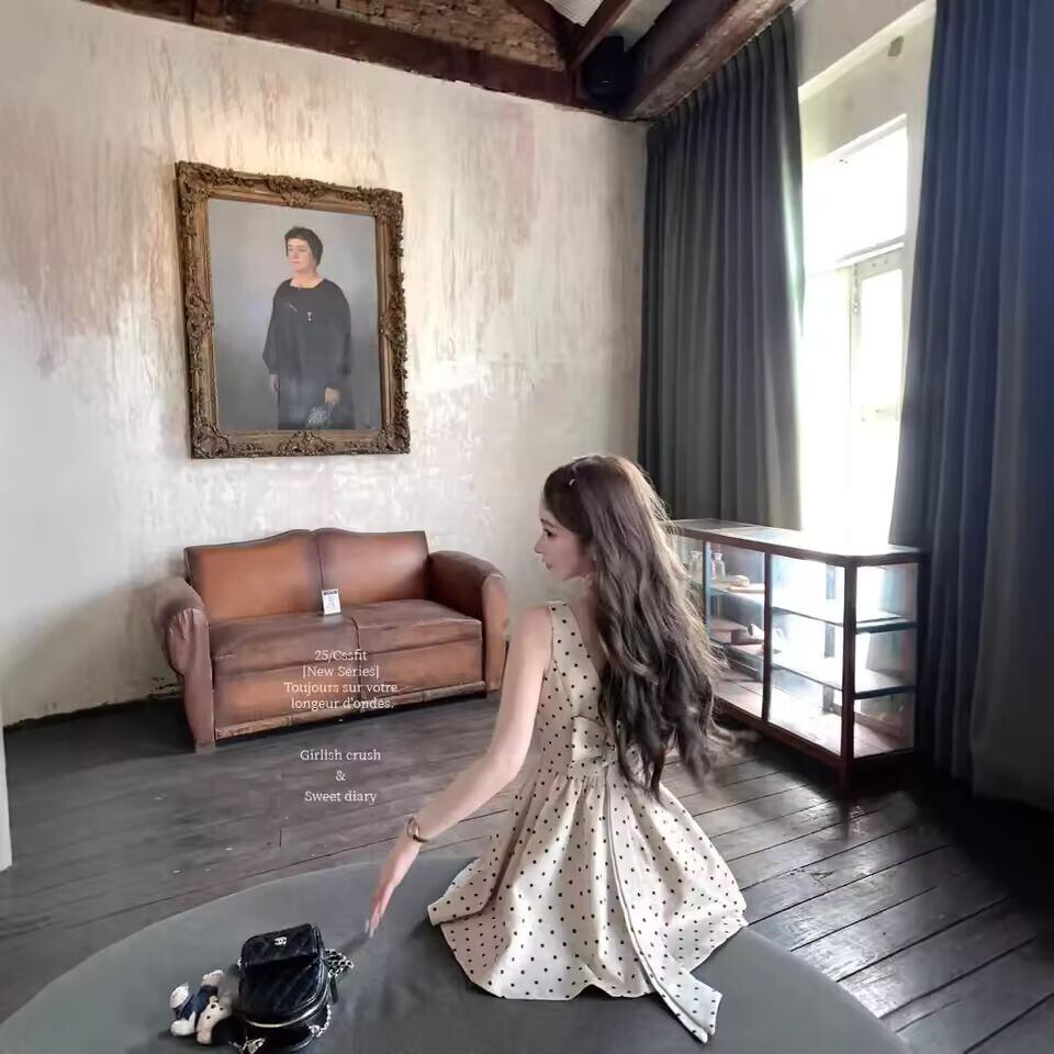 送料無料 2025年夏 水玉模様 蝶ネクタイ カラーブロック ノースリーブ レディース ミニドレス ベストスカート ショートスカート フレンチスタイル ポリエステル繊維