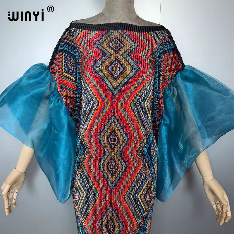 送料無料 WINYI バブルスリーブプリーツドレス ビーチカバーアップ ボヘミアンカフタン アバヤ ドバイ ラグジュアリーパーティードレス ロング丈 ムスリム女性用イブニングドレス