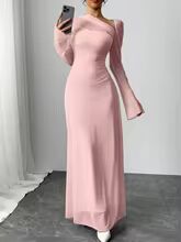 送料無料 春夏新作レディースピンクチュール爆発スリム不規則な斜め肩超ロングドレス