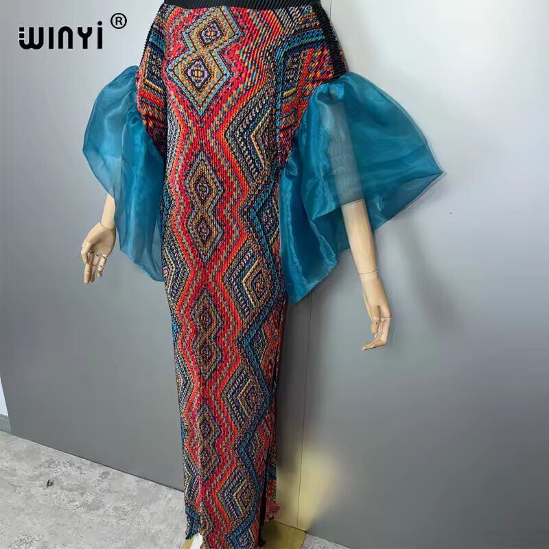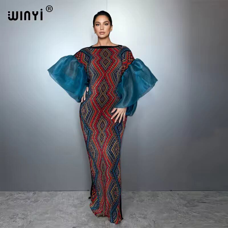 送料無料 海外発送 WINYI バブルスリーブプリーツドレス ビーチカバーアップ ボヘミアンカフタン アバヤ ドバイ ラグジュアリーパーティードレス ロング丈 ムスリム女性用イブニングドレス