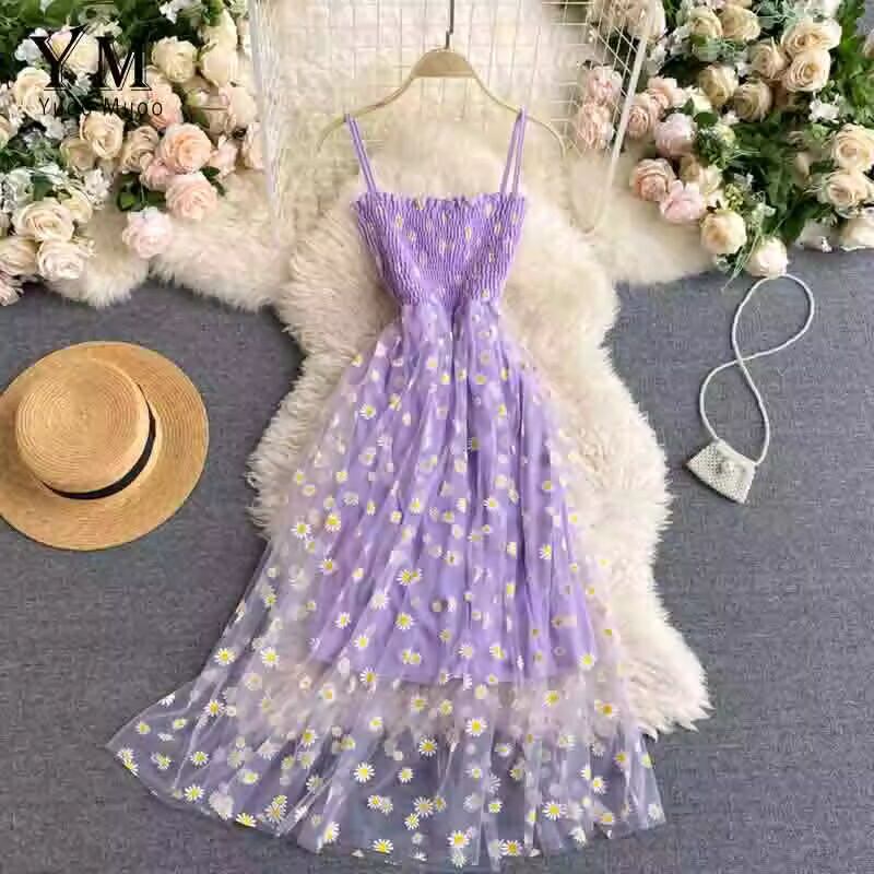 送料無料 海外発送 YuooMuoo 韓国ファッションデイジーフラワープリントメッシュパーティードレス夏二層スパゲッティストラップ休暇ミディドレスビーチ Vestidos
