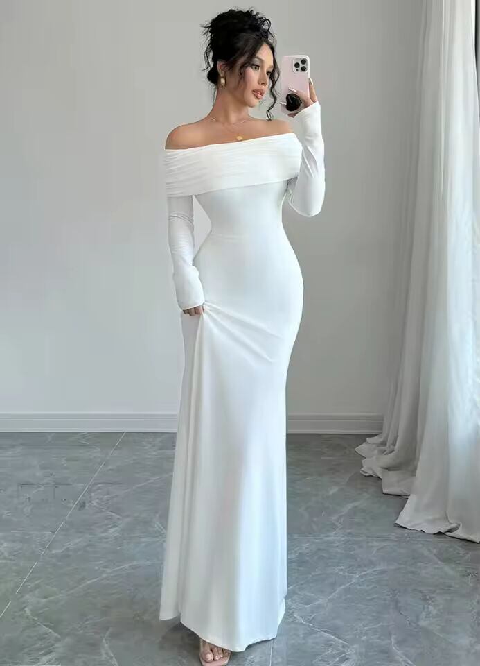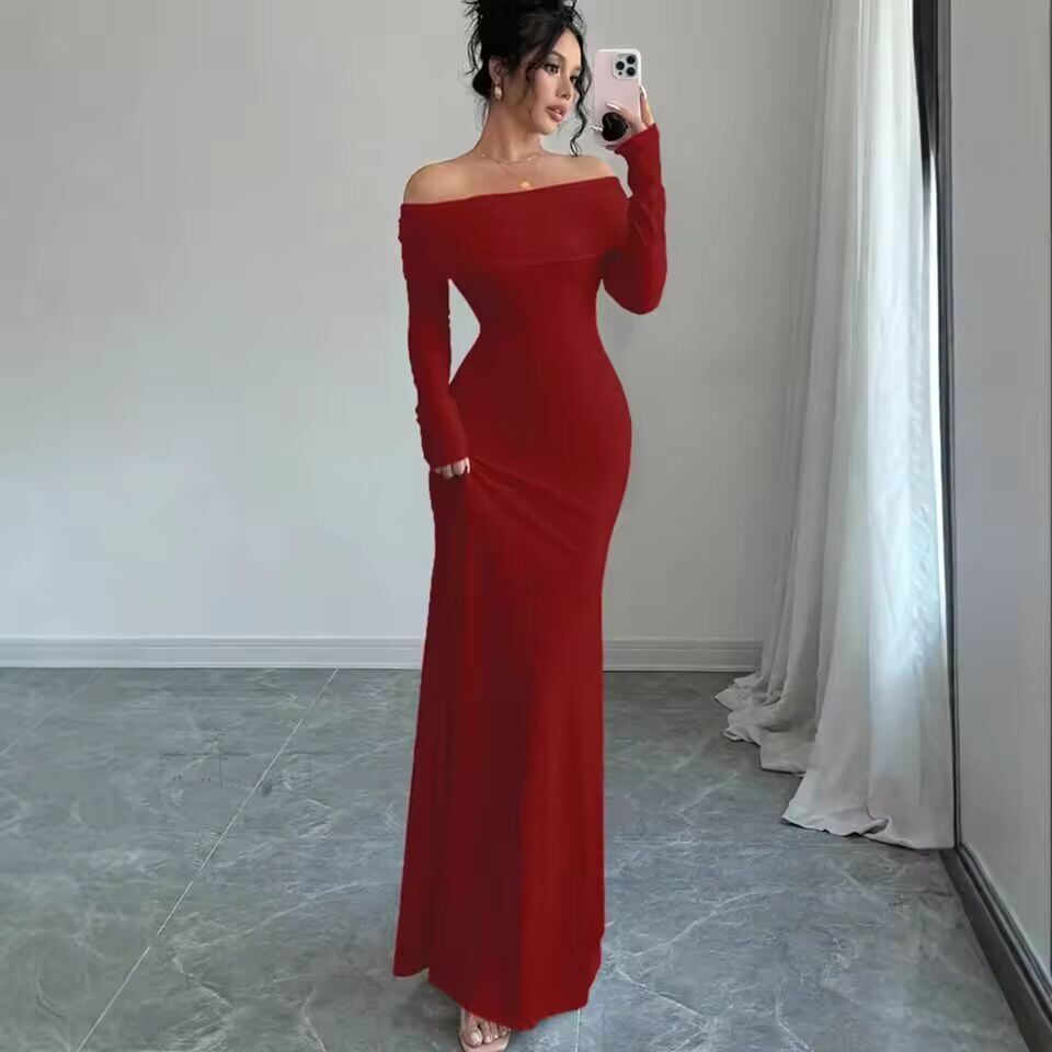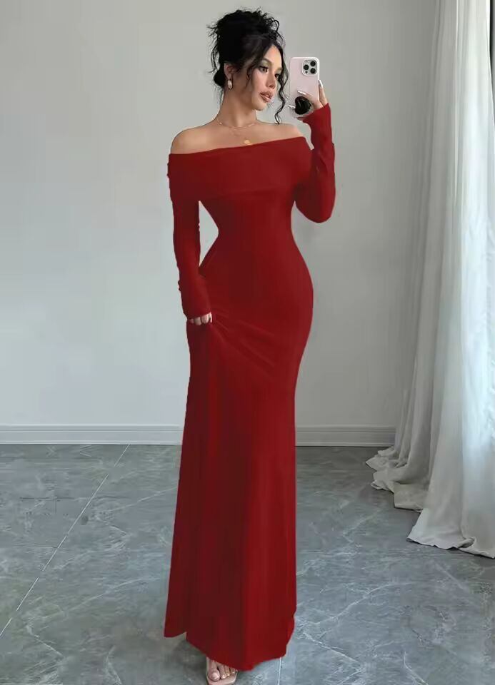 送料無料 海外発送 エレガントなロングワンショルダー弾性ポリエステルドレス秋の新スタイル四次元弾性ボディコンガウン女性用
