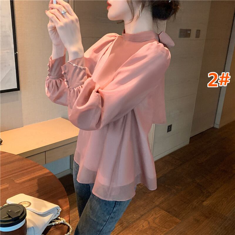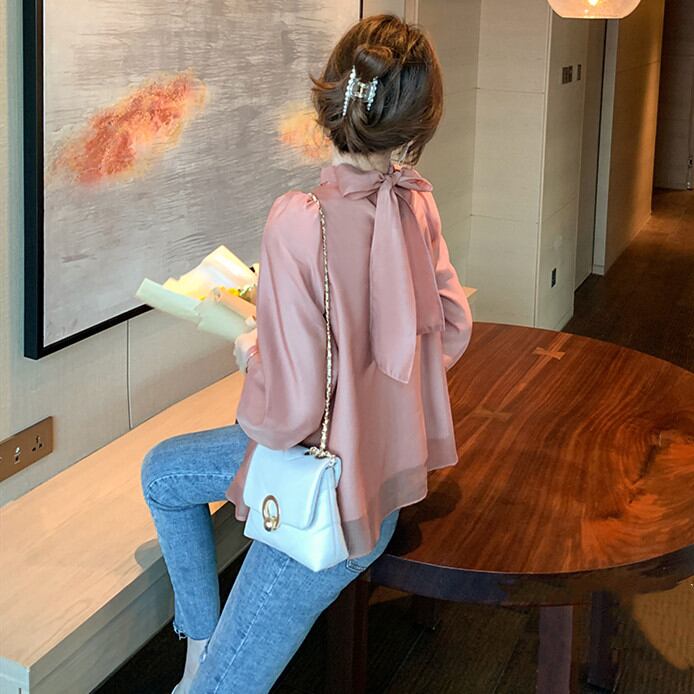 2026春夏新作 ブラウス シフォンシャツ レディーストップス 背面リボン 韓国風 長袖シャツ オシャレ 2色