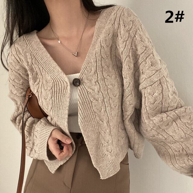ニット カーディガン レディース ざっくり編み ケーブルニット ショート丈 短め vネック セーター 秋冬