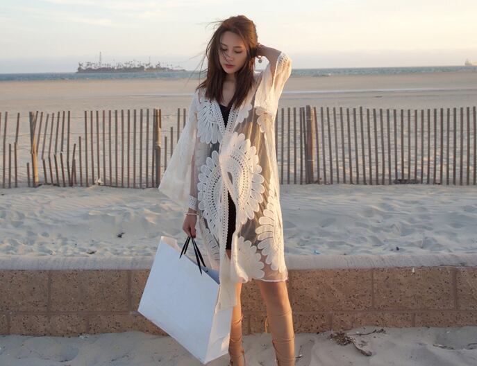 ◎【送料無料】花柄レース カーディガン ひまわり柄 レースカーディガン ロング サマー コート シースルー 透かし