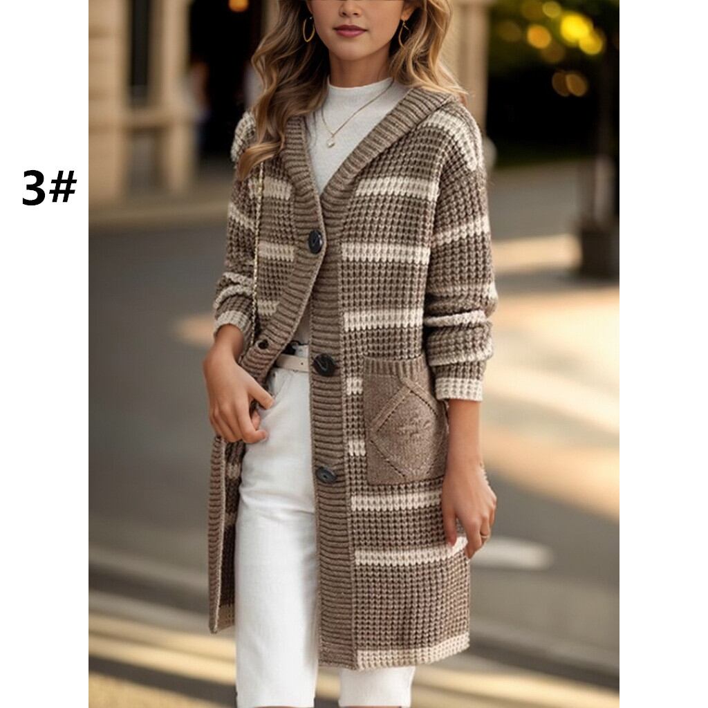 ◎【送料無料】ロングカーディガン カーディガン ニット ロング丈 ゆったり 羽織り ボーダー柄 カジュアル フード付き