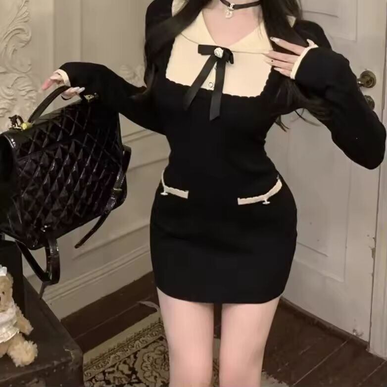 【送料無料◎】 新作カラーブロックバタフライノットニットワンピース レディース 秋 ウエストシェイプ ショートミニスカート おしゃれ ブラック ボディコンワンピース