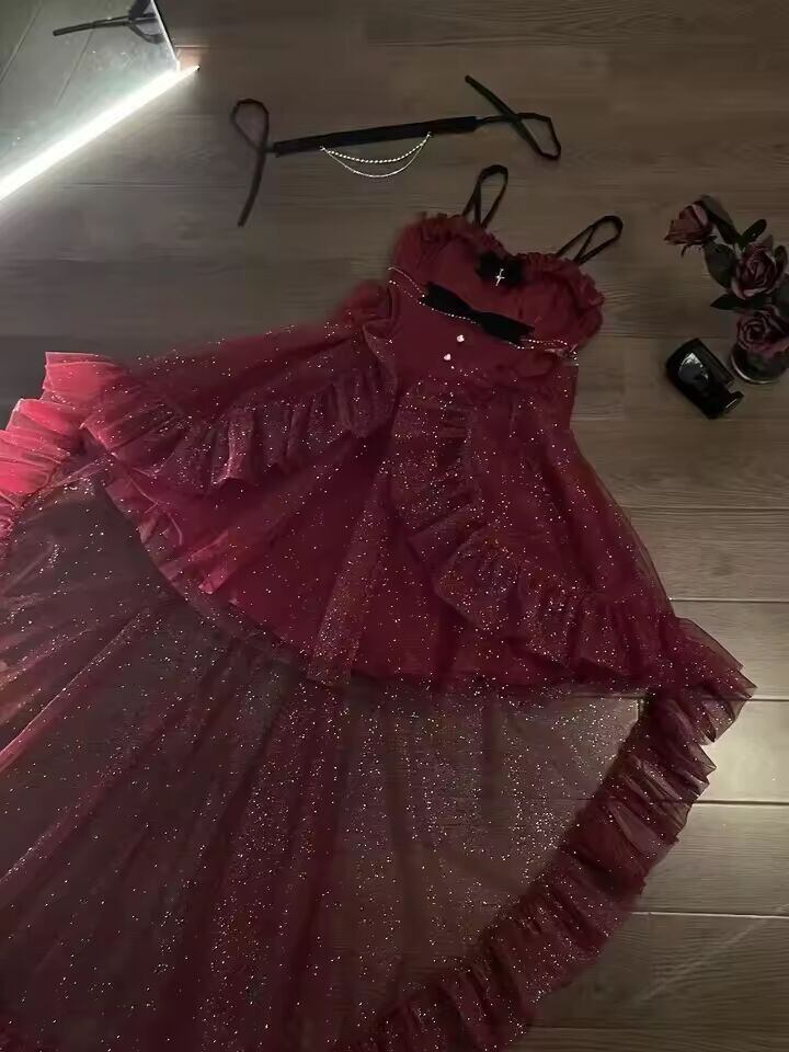 【送料無料◎】 ゴシック Y2k スリングドレス女性原宿レトロチュールフリルトリムクリスマスパーティー衣装グランジ美的ノースリーブエレガントな着用