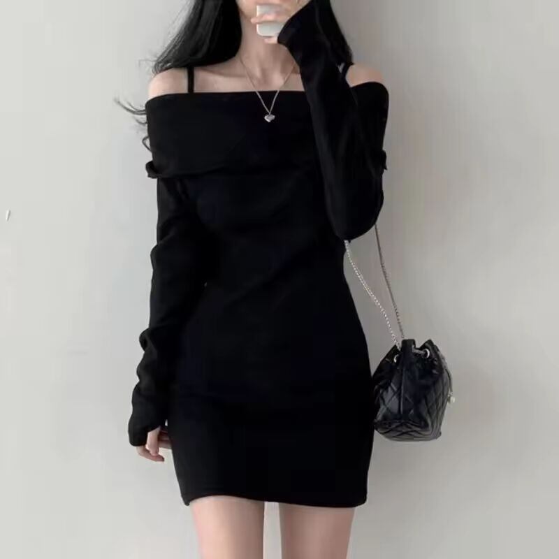 【送料無料◎】 シックな韓国ニットミニドレス肩ベアストラップネックラインスリムフィットリブラップアラウンドスカートフルスリーブ一言襟