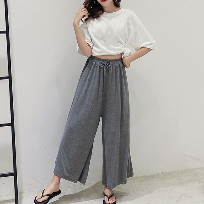 ◎【送料無料】ワイドパンツ レディース パンツ 楽ちんパンツ ハイウエスト ウエストゴム カジュアル フレアパンツ 九分丈