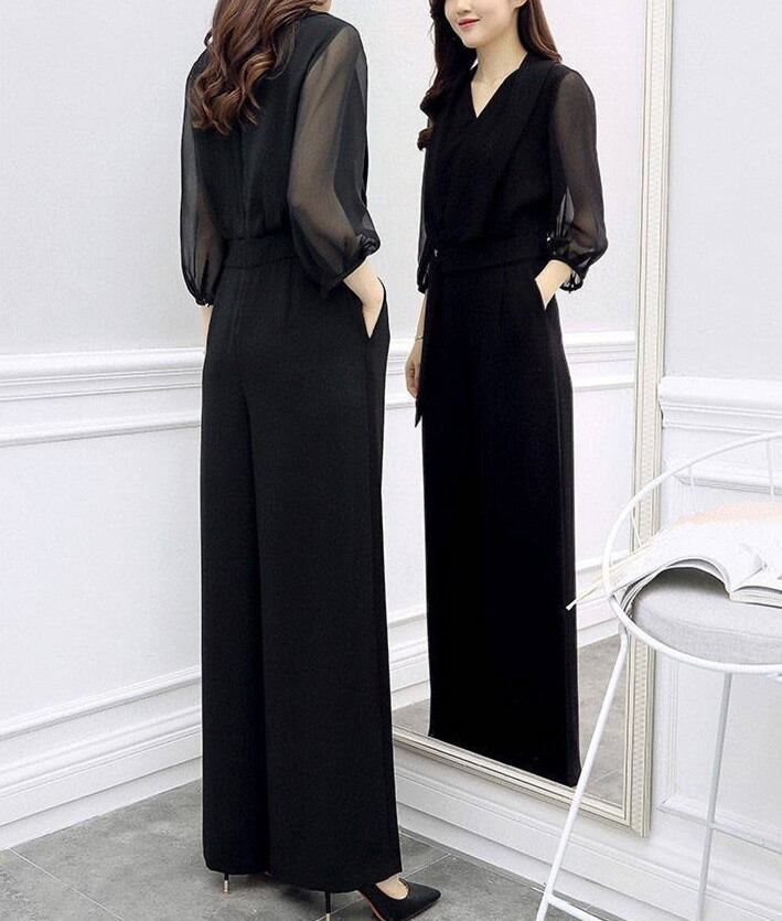 腕部分はシースルーシフォンレース切替になった大人上品な黒のパンツドレスです。