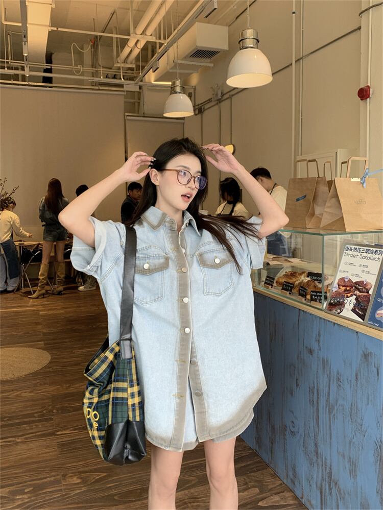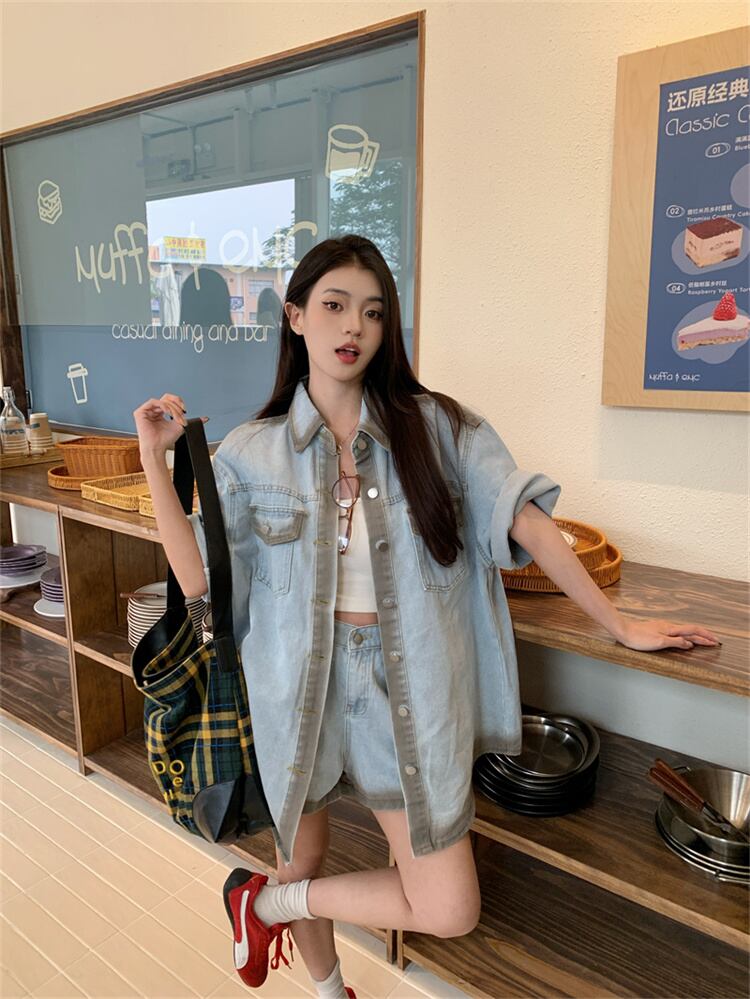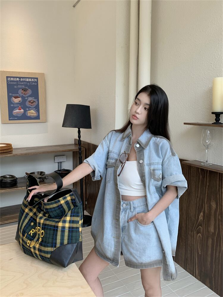 涼感デニムセットアップ 半袖シャツとショートパンツ