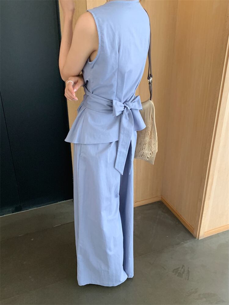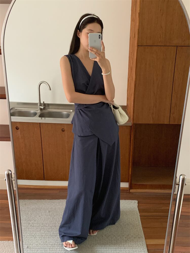 ◎【送料無料】無袖クロスストラップデザイントップスとゆったりハイウエストパンツのカジュアルコーデ 2カラー展開