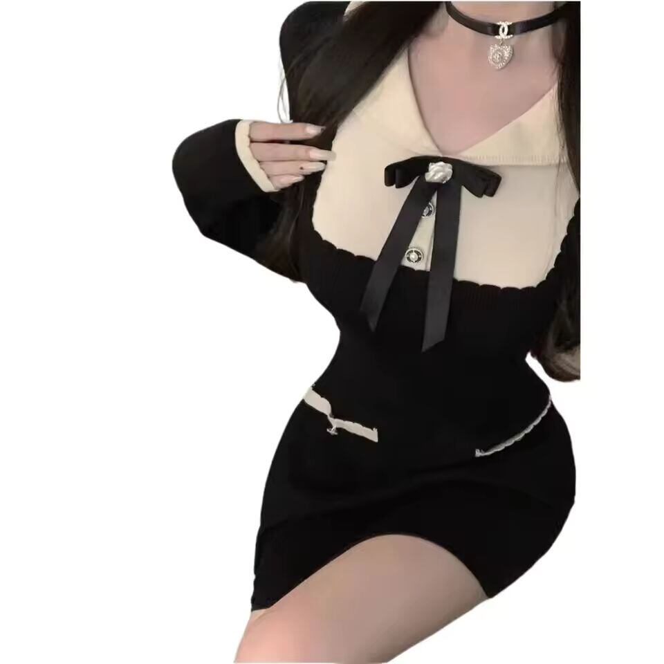 【送料無料◎】 新作カラーブロックバタフライノットニットワンピース レディース 秋 ウエストシェイプ ショートミニスカート おしゃれ ブラック ボディコンワンピース