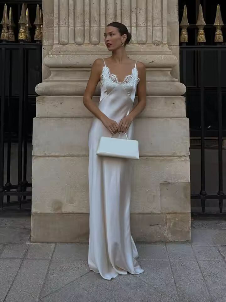 【送料無料◎】 セクシーな女性用Vネックサテンスリングマキシドレス、シックなホワイトレースパッチワーク、ノースリーブ、バックレス、スリムロングガウン、シックなイブニングパーティードレス