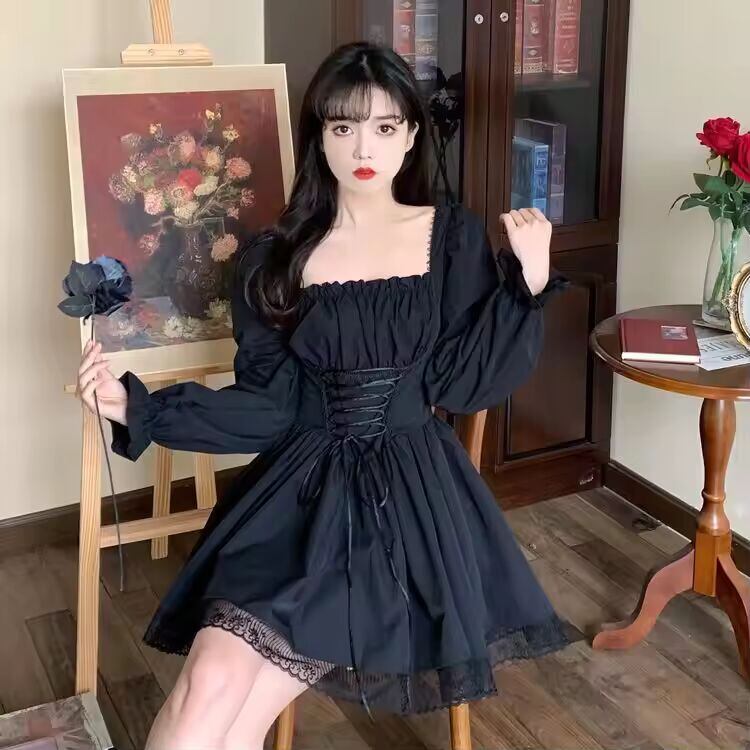 【送料無料◎】 キュートなドレス スクエアカラー タイウエスト ショートAラインスカート 長袖 ハイウエスト ポリエステル繊維 無地 春物 ホットセール