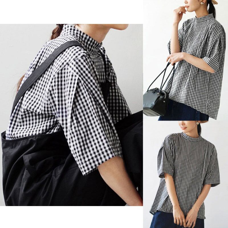 ◎【送料無料】人気新作 ブラウス レディース トップス チェック柄 半袖シャツ 立ち襟 気質 おしゃれ