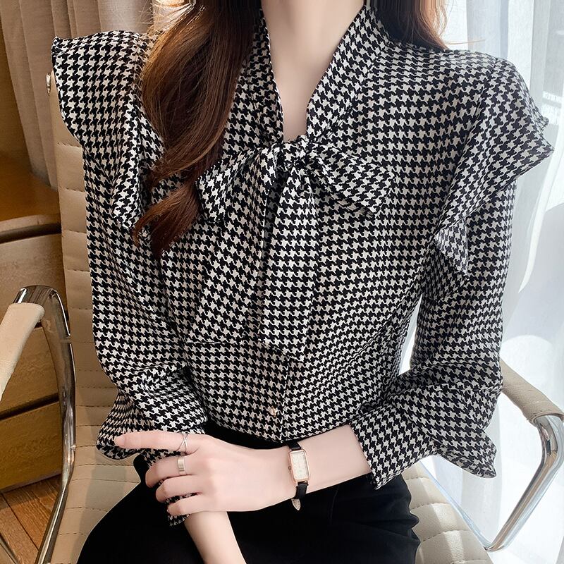 ◎【送料無料】ボウタイ リボン ブラウス 千鳥格子 ボウタイブラウス レディース 長袖 トップス