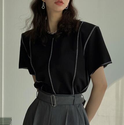 ◎【送料無料】ファッション トップス Tシャツ ブラウス クルーネック 半袖 ショルダーパッド 夏
