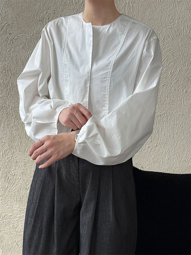秋コレクション2025 丸首 ゆったり長袖 灯笼袖デザイン シャツ