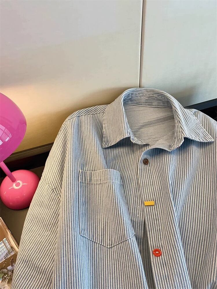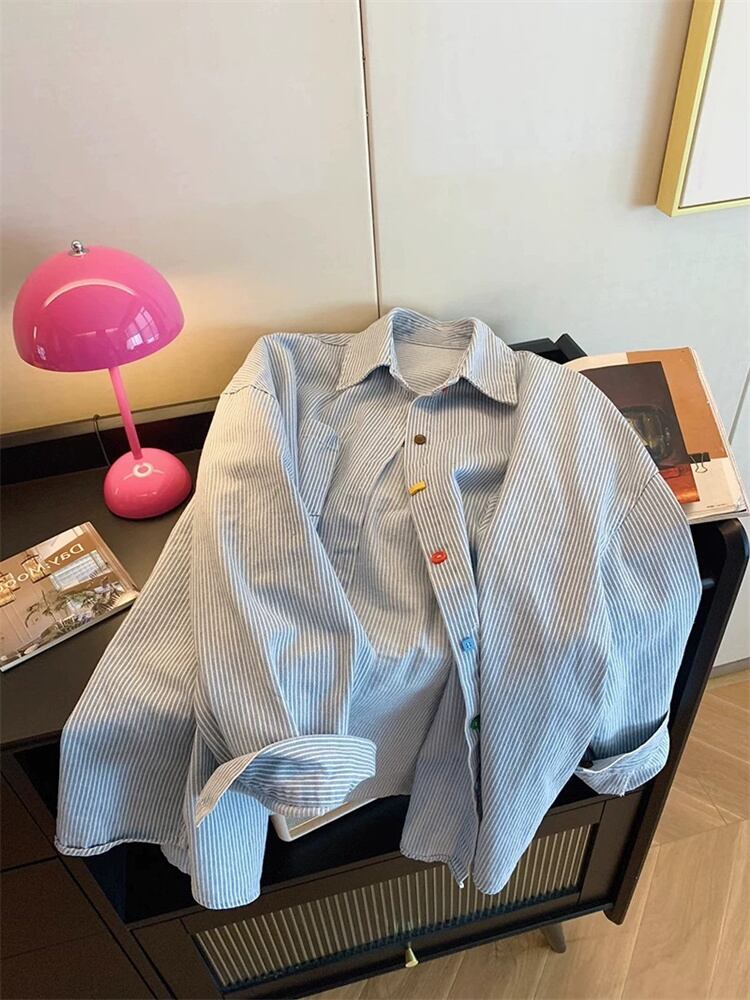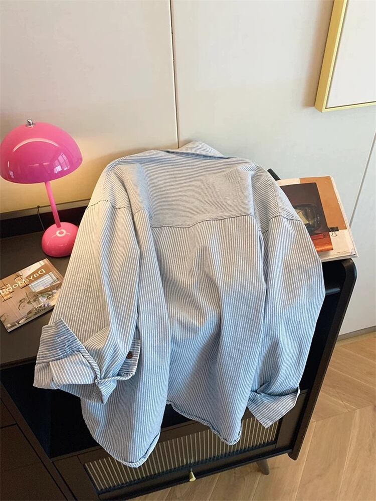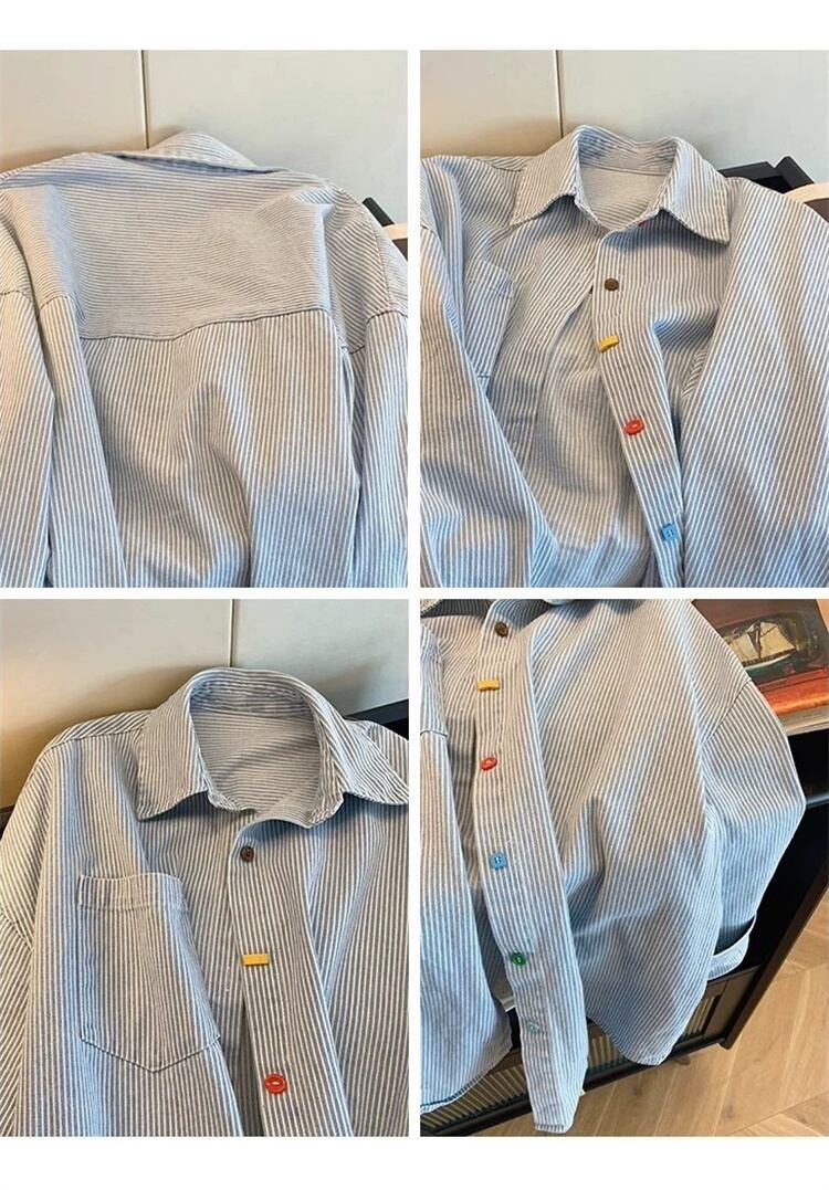◎【送料無料】縦縞ポロシャツ ヴィンテージシンプル オーバーサイズ長袖 2025春