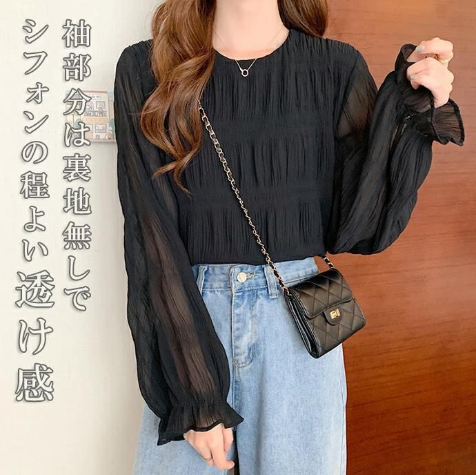 ◎【送料無料】【春秋新作】レディース 長袖 ブラウス ギャザー 透け感 フリル レース 春秋
