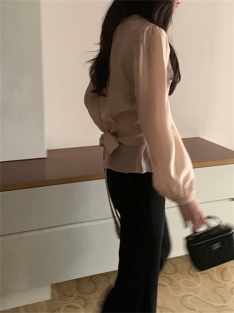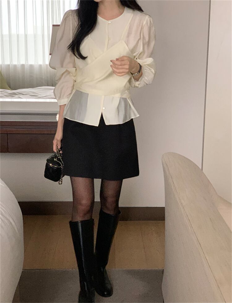 ◎【送料無料】丸首交差ベルト 見せかけツーピース ロングスリーブシャツ