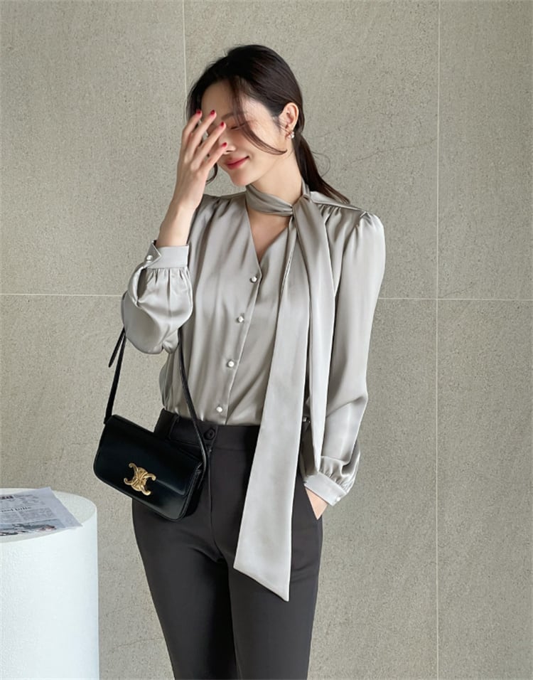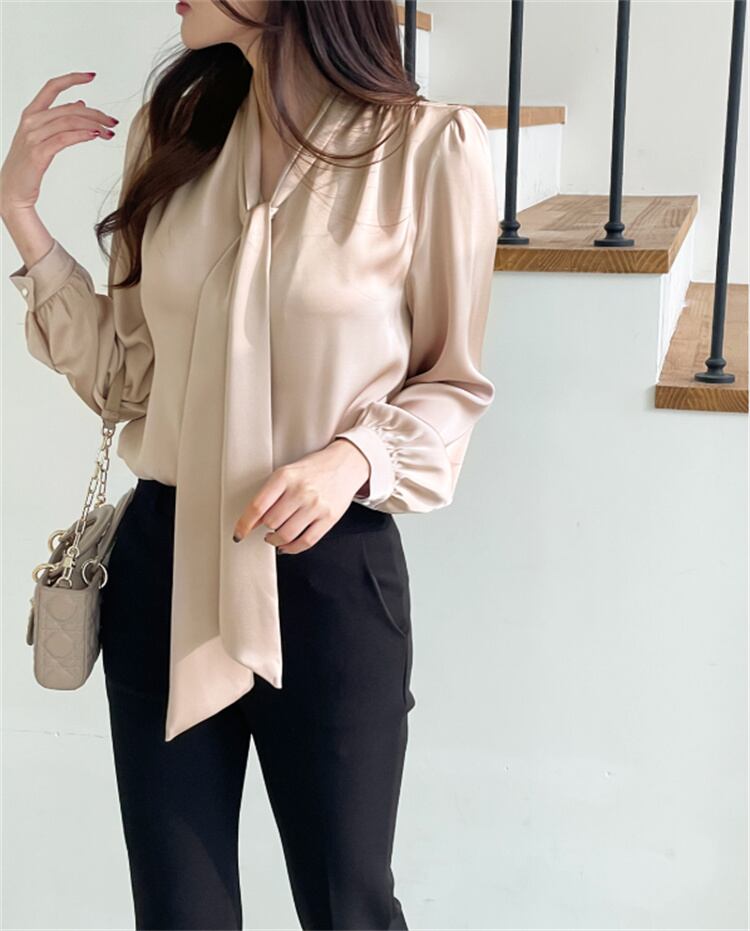 エレガントなロングスリーブVネックシャツ 無地 通勤向け 2025春