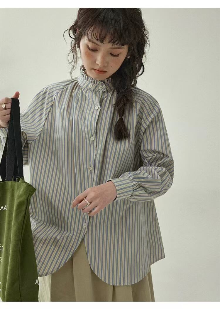 通勤シーン向け 秋の縦ライン長袖シャツ 大きめサイズ展開