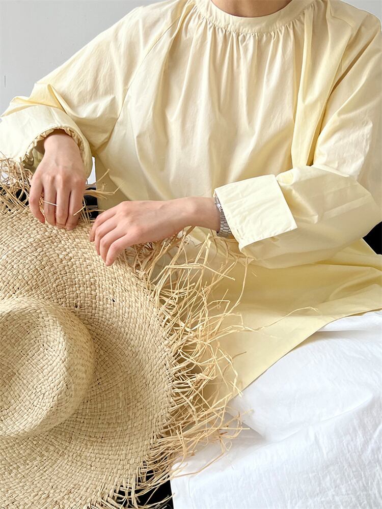 シンプルなロングシャツ 丸首ロングスリーブ ミドル丈 カジュアルベース