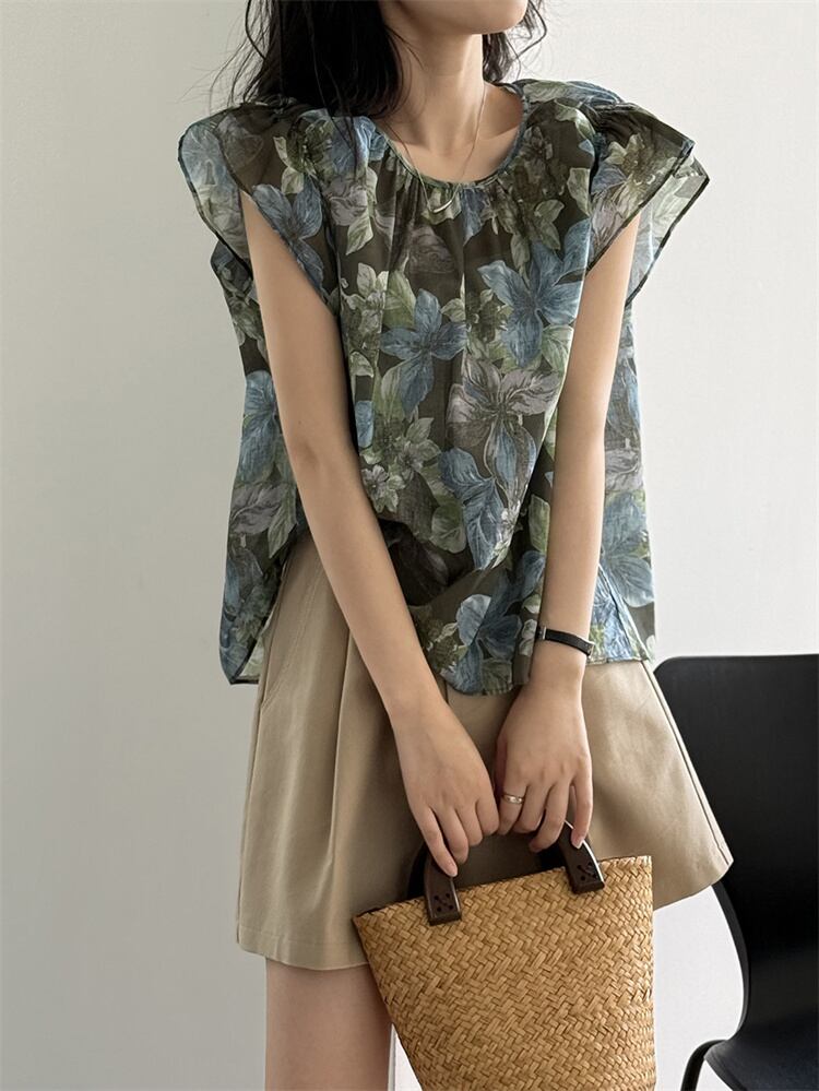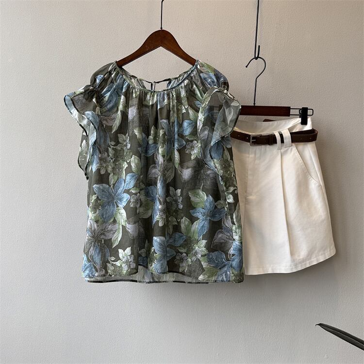 2025サマー新作 小柄柄 丸首フリル袖 薄手透け感 ルーズトップス