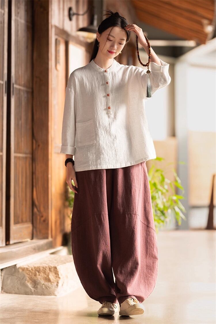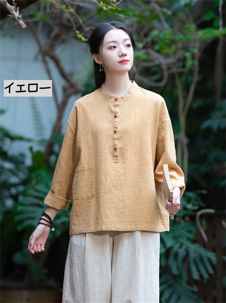 春夏季 リラックスフィット カラーブロック柄 立ち襟 伝統ボタン リネン混 長袖シャツ 大きいサイズ