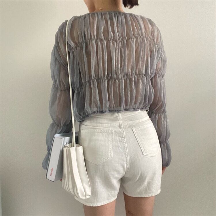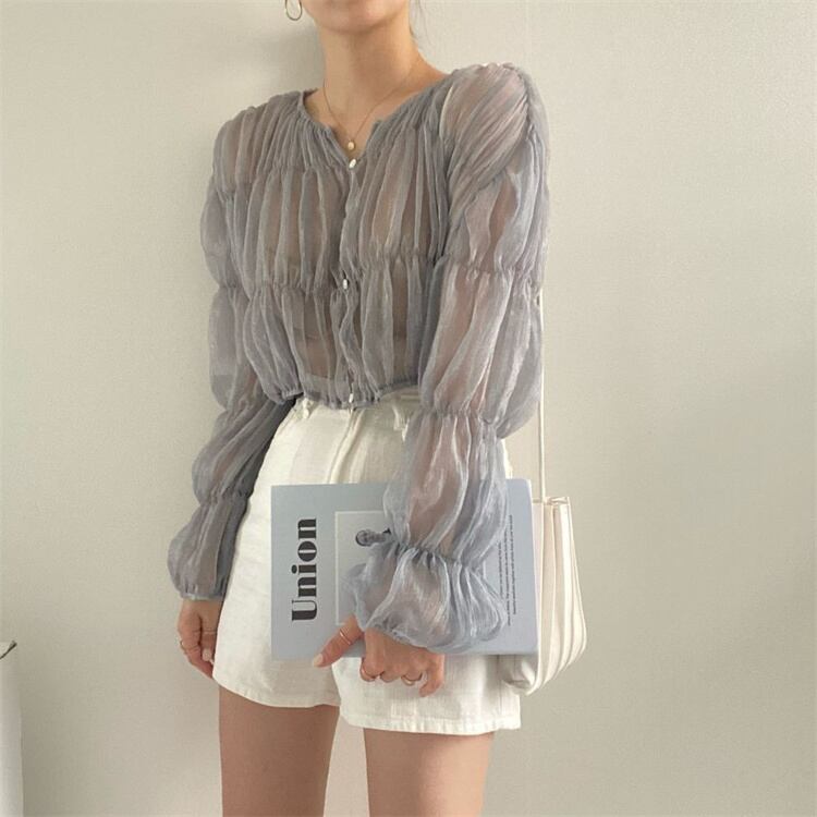 透け感プリーツデザイン 夏の温かみVネックルーズシングルボタン長袖シャツ