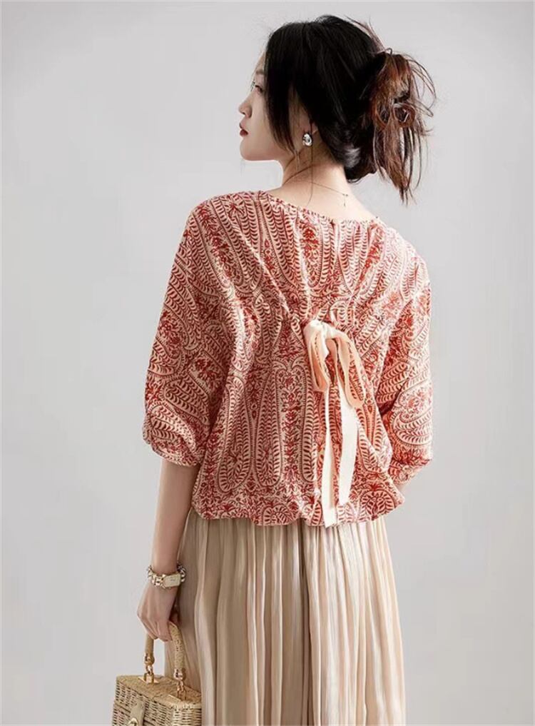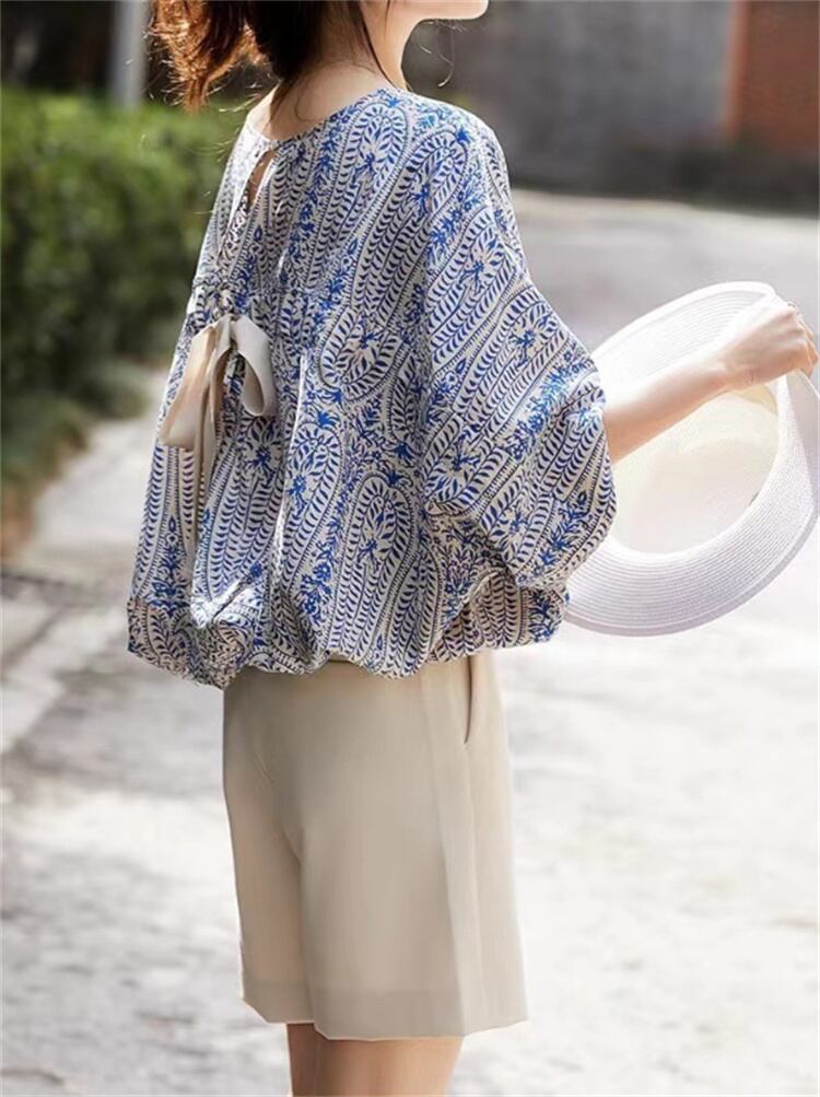 ◎【送料無料】2025年夏 丸首のプリント入り バット袖 後ろにボウタイ付き 緩やかなハ喇叭袖七分袖シャツ