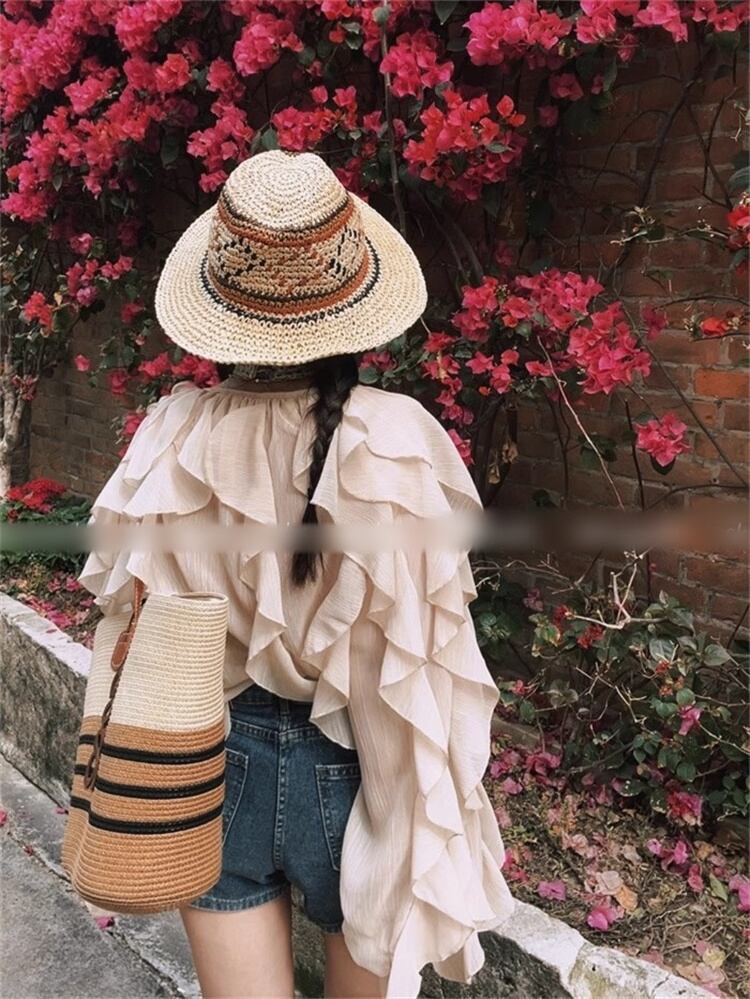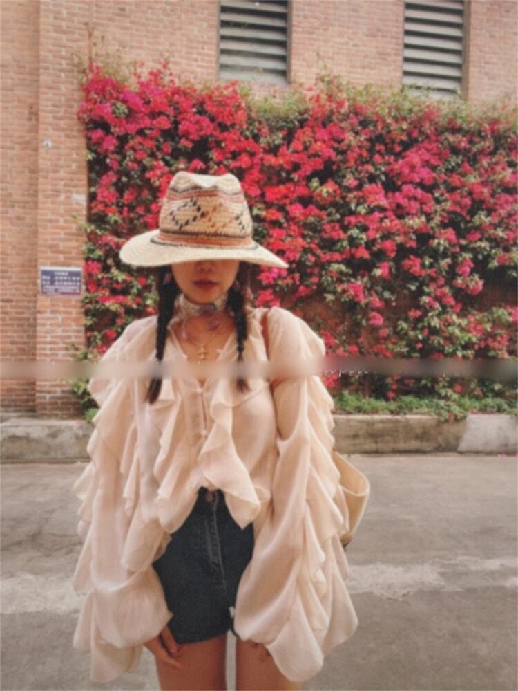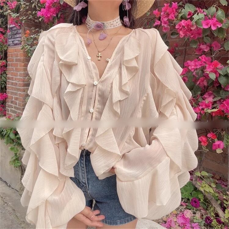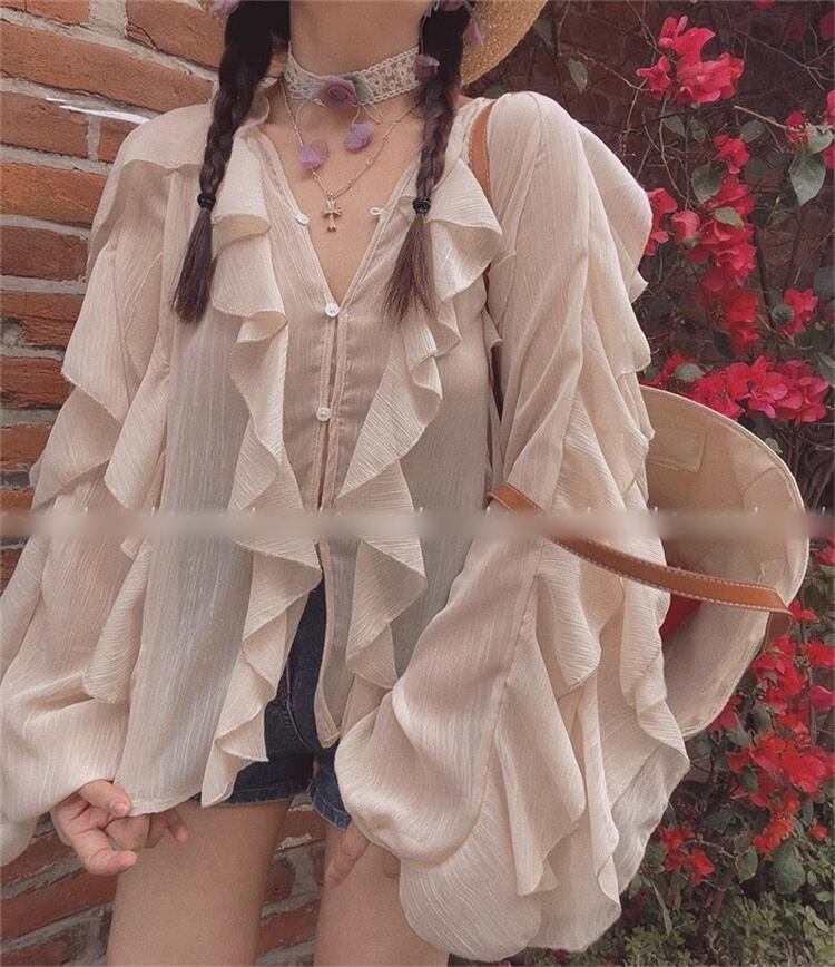 2025春夏 ヴィーネック レースエッジ付きランタン袖 バケーション用の長袖トップ