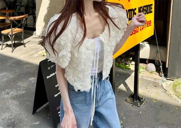 2025夏新作 立体ローズ透かし編みトップス ゆったりタイドアップ仕様 ロマンチックな雰囲気
