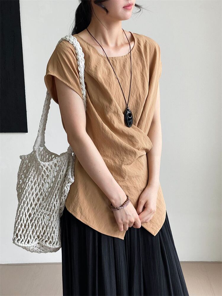 ◎【送料無料】【韓国トレンド】綿麻ミックス クロスネックティー&サイドスリット フリフリ袖 シェイプアップトップス